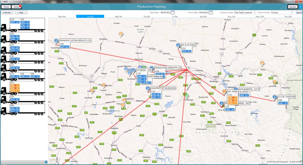 In the image below the days across the top of the map are actually a ListBox, the selected day brings forward and expands the order pins and lists the available trucks for that day. You simply drag the order from the map screen to the truck on the side to plot a route, you can even drag order items between trucks to re-route them.