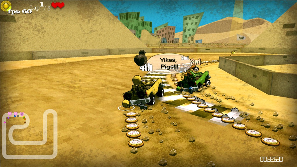 Here’s a sample screen-shot of this weekends work. I’ve been putting the extra performance I gained at the start of the week into moving most of the HUD sprites into 3D objects surrounding the player’s kart.