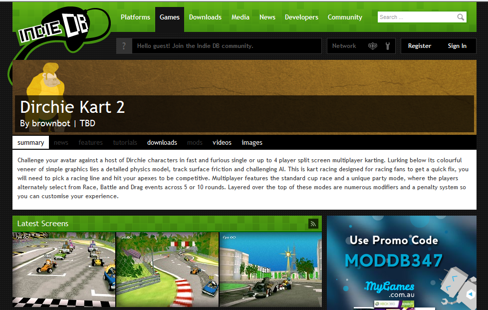 I’ve finally managed to get find the Dirchie Kart binaries a new home. My old file host suspended me for too many downloads after I got some exposure on indiegames.com, apparently 20gig in a week is too much!