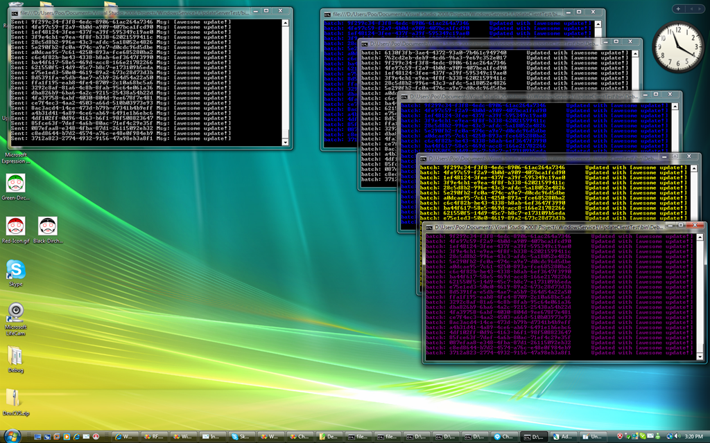 You can see the server which holds a master list of BatchIDs in the bottom left and a console client above it which simple lists out the sequence of BatchIDs when an update is received by the clients.