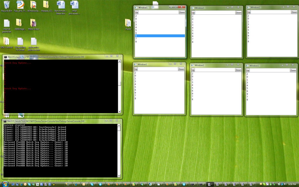 The image to the left shows 6 WPF clients with the same list of “BatchIDs” (ObservableCollection<string>), manipulating the list on any client re-arranges the list on the other clients.